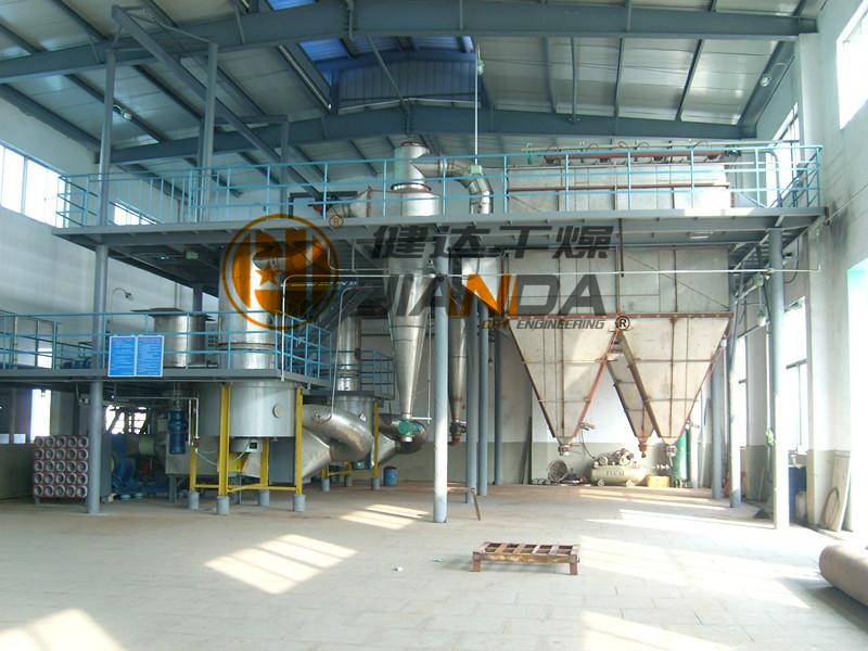 根據(jù)PVB的物料特性,健達(dá)干燥采用旋轉(zhuǎn)閃蒸干燥機(jī)來干燥PVB,整套設(shè)備采用蒸汽加熱,干燥處理能力為800Kg/h,可將初水分35%的濕物料烘干至1.5%以下,由于物料是熱敏性物料,所以干燥機(jī)的主機(jī)夾套水冷卻,由于物料承受溫度較低,則進(jìn)風(fēng)溫度較低,所以主塔加高一節(jié),以延長(zhǎng)物料干燥時(shí)間,整個(gè)系統(tǒng)物料接觸處為不銹鋼制作,其余為碳鋼制作。尾氣處理系統(tǒng)主要由旋風(fēng)分離器、布袋除塵器及引風(fēng)機(jī)組成,通過旋風(fēng)分離器及布袋除塵器對(duì)尾氣中的粉塵進(jìn)行處理。